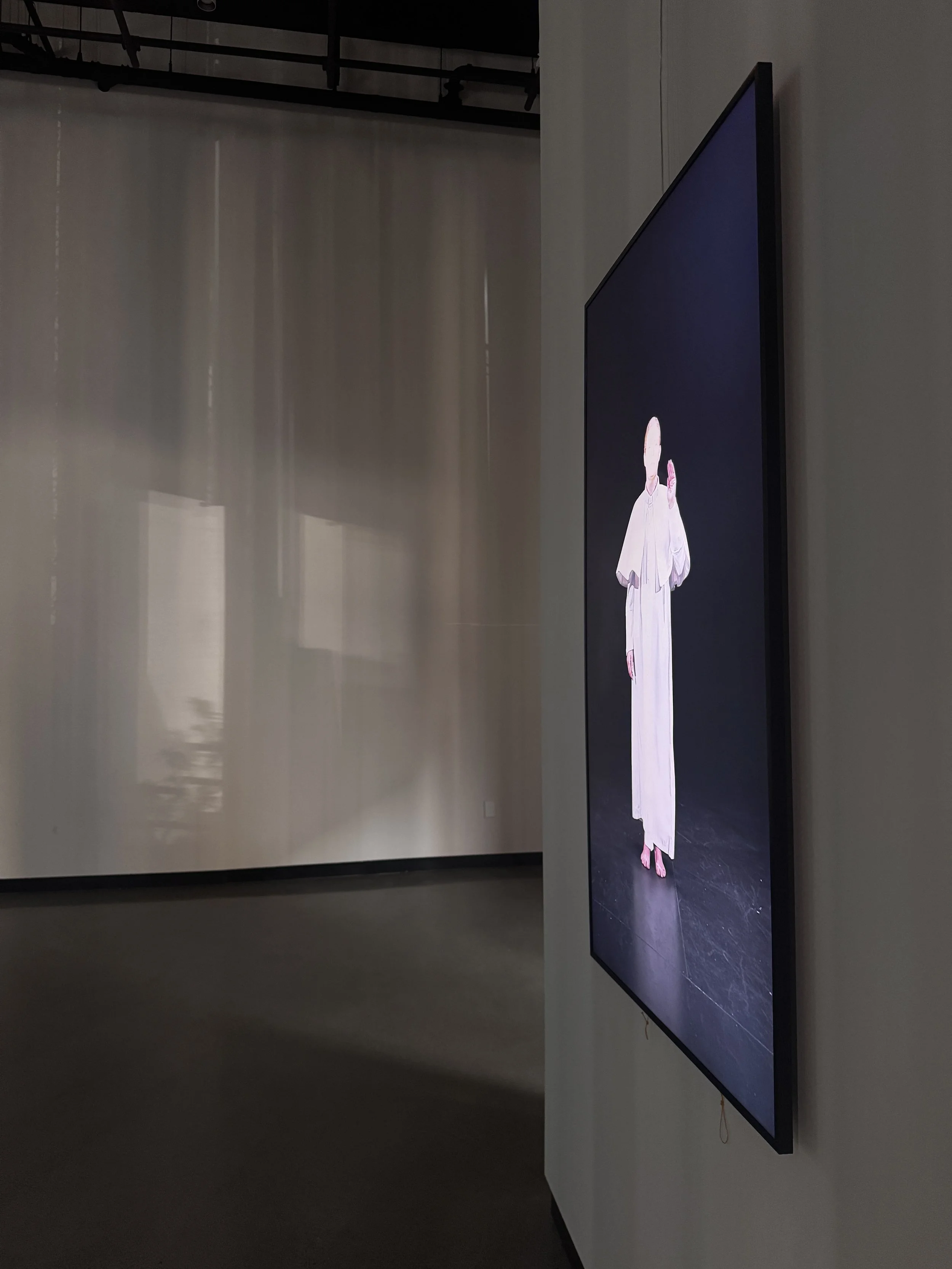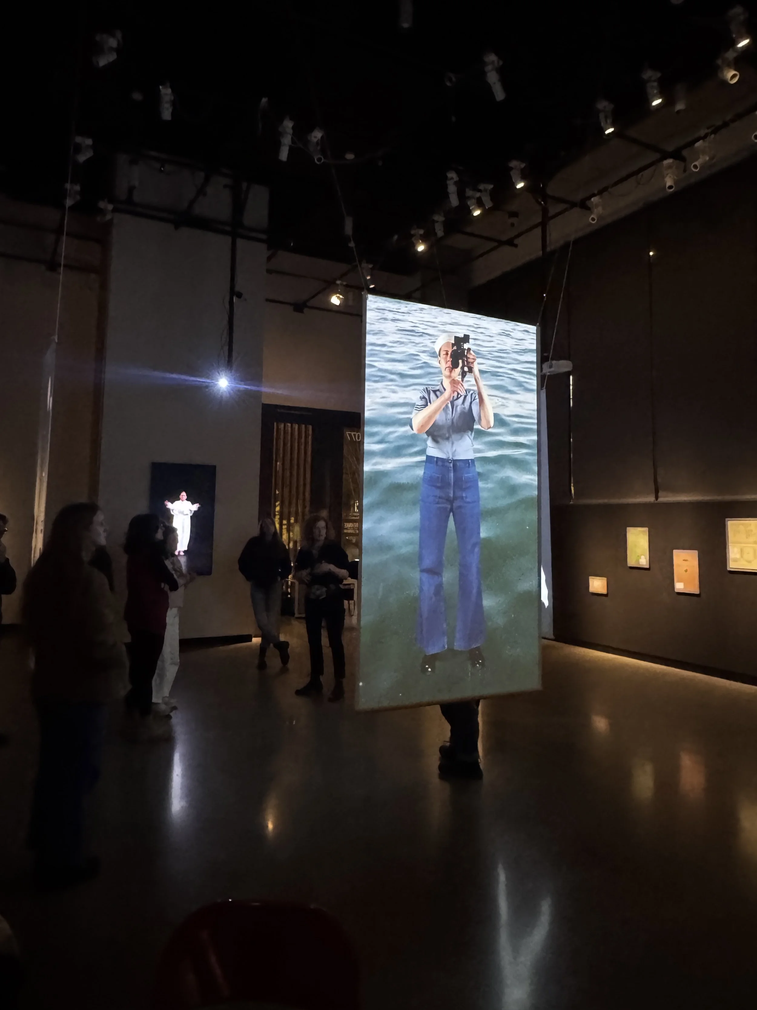 The word “dead” as it refers to the use of the sextant derives from “deduced.” Here, Dead Reckoning takes on dual meaning as Burns unravels the narrative of her familial history, The Navigator in the center. There is also The Constable and The Fighter, each character represented by Burns, trapped in their own void-like space on a projector screen hung above eye-level at a life-like scale. They specifically reference Burns’s paternal past in some way: the four generations of military men in the family, the impact of Catholicism, and in the case of The Fighter, a book called Marshall Stillman’s 1920: Shadow Boxing - How to Train And Advice on Living, Rules of the Ring. I became a bit fixated about the whiteness of the outfit on The Fighter, which Burns says is simply a replication of the outfits in the popular boxing manual of the era when her Grandfather would have used it. I initially was thinking about the “Whiteness” in terms of race or religious purity. Perceptions of race have changed over time, especially in the context of Irish immigrants, who faced xenophobia in the US until the privilege of the color of their skin allowed them to assimilate into the institutionalized idea of “Whiteness.” Many White artists don’t actively investigate or reckon with this. Even if not the direct reference here, it is underpinning what I see. Her work is quite stoic in its presentation for a process that I imagine elicits such vulnerability and “grief,” as mentioned in an essay by Sharon Arnold that is at the entrance of the gallery.